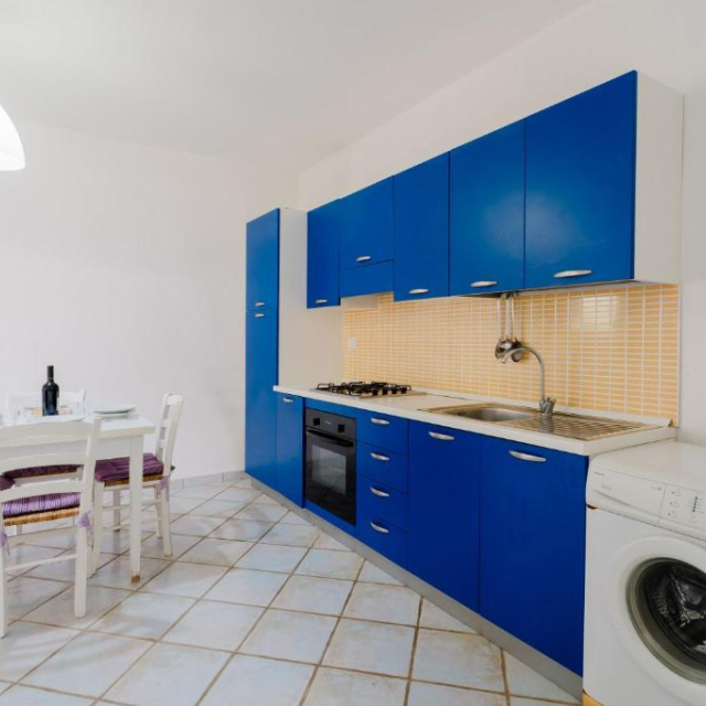 - al piano terra, la zona giorno è composta da una sala da pranzo con angolo cottura e un divano letto doppio e un bagno con box doccia.