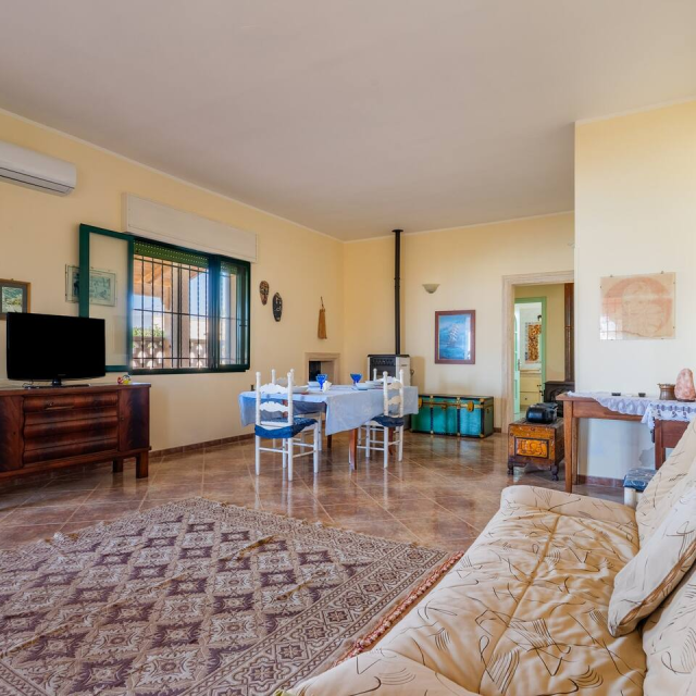 ampia sala da pranzo con divano letto matrimoniale, tavolo e sedie climatizzata