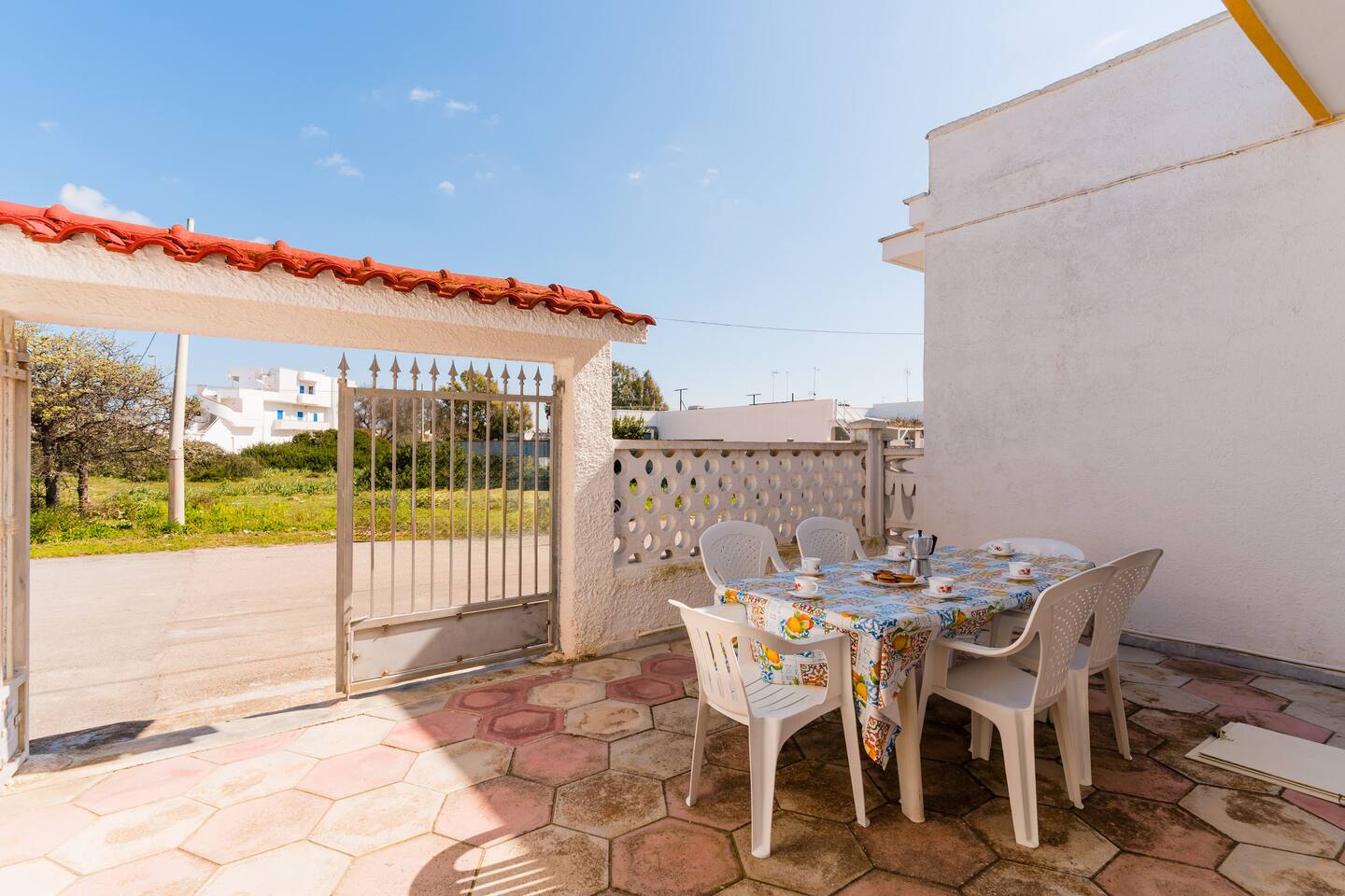 -entrata con ampio giardino e doccia esterna tavolo e sedie per consumare pasti comodamente