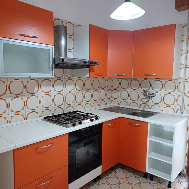 Cucinino attrezzato di tutto accollato ad un altro piccolo spazio esterno dove è presente una doccia esterna e lavatrice.