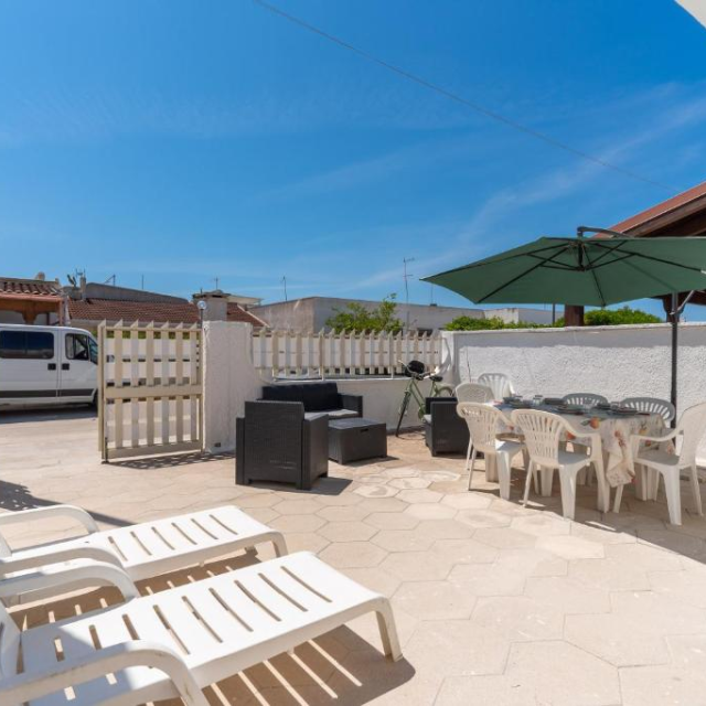 entrata direttamente con auto grande spazio esterno intorno con sedie e tavolo per pranzare e cenare comodamente fuori compreso di doccia esterna e un lavabo