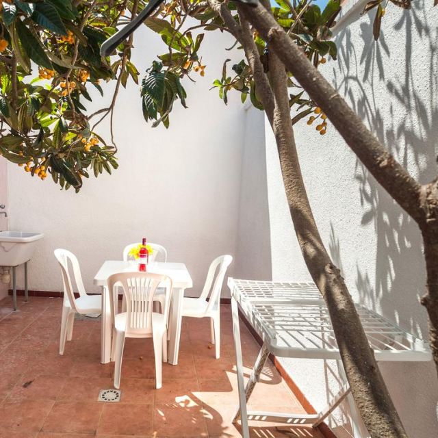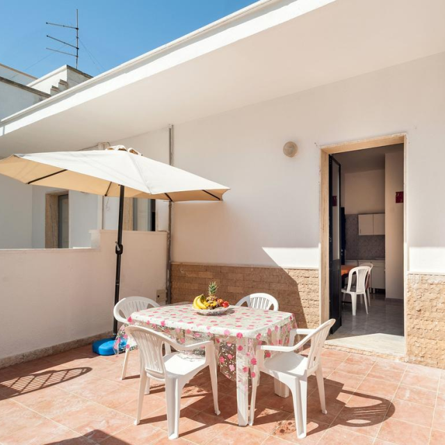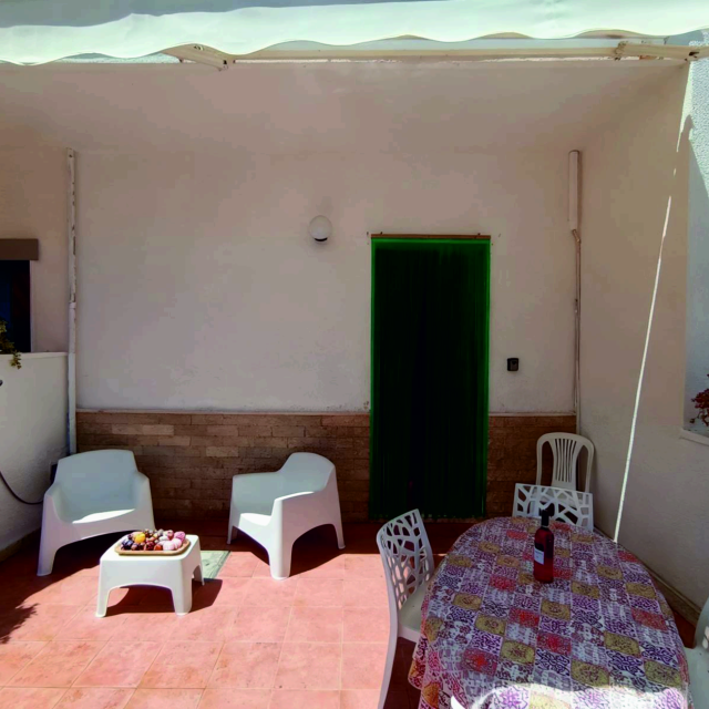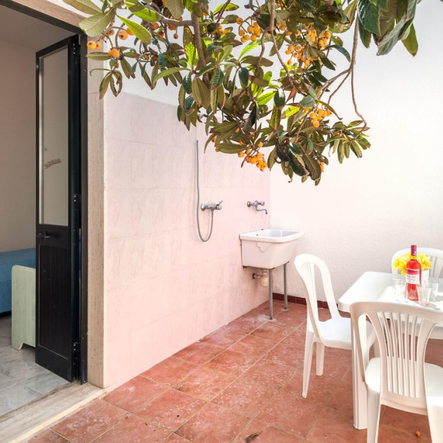 -entrata con ampia veranda con tavolo e sedie comoda per consumare liberamente pasti a l’esterno più un doccino molto comodo all'arrivo dalla spiaggia.