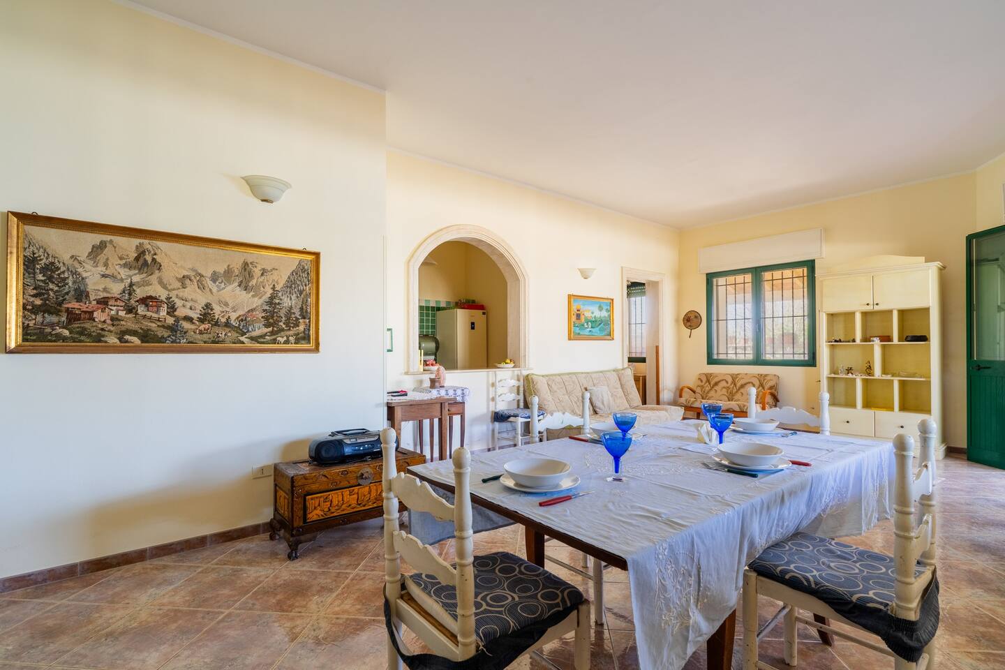 ampia sala da pranzo con divano letto matrimoniale, tavolo e sedie climatizzata