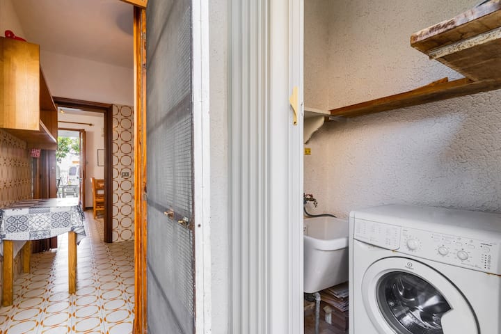 Cucinino attrezzato di tutto accollato ad un altro piccolo spazio esterno dove è presente una doccia esterna e lavatrice.